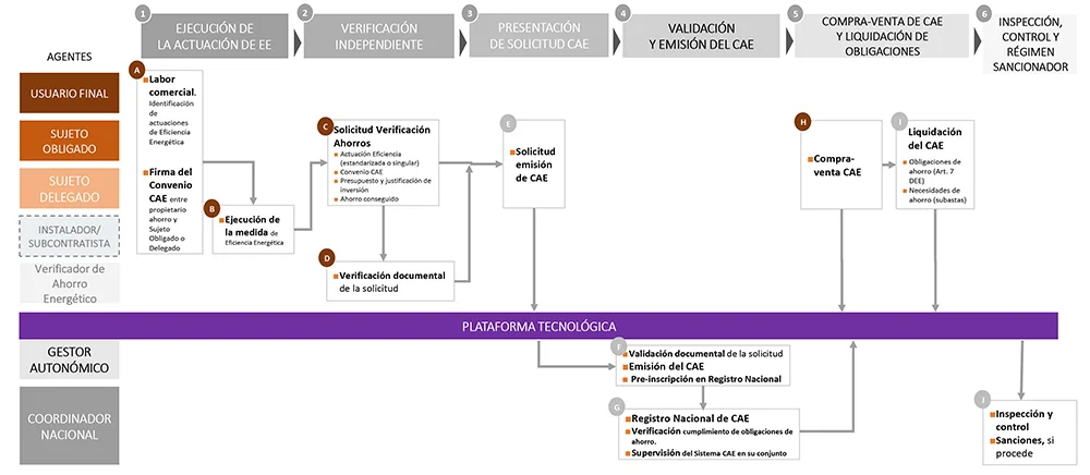 Las empresas que venden energía, llamadas sujetos obligados, deben cumplir objetivos de ahorro energético. Pueden hacerlo mediante la compra de CAE o contribuyendo al Fondo Nacional de Eficiencia Energética.